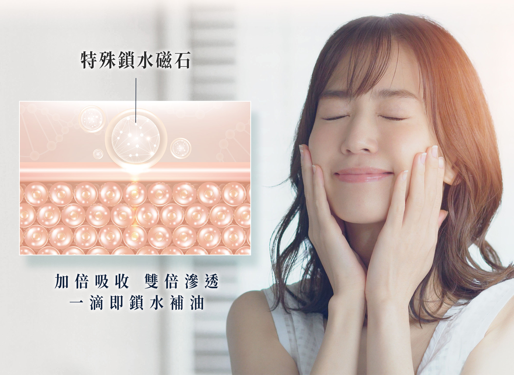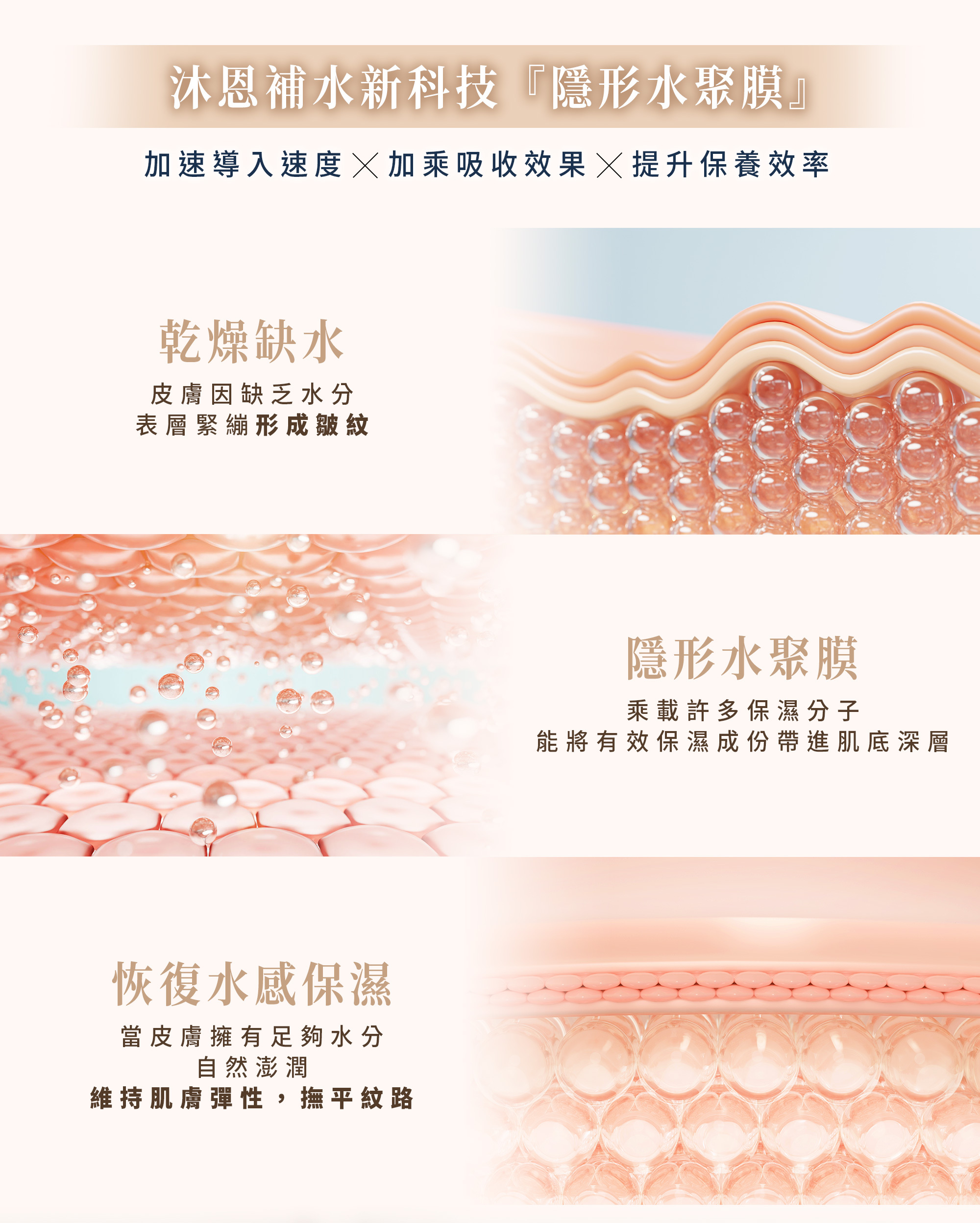 補水新科技『隱形水聚膜』+高效保濕成份『玻尿酸&鎖水磁石』深入肌膚補水彈潤,提高保濕度,增加彈性,撫平細紋