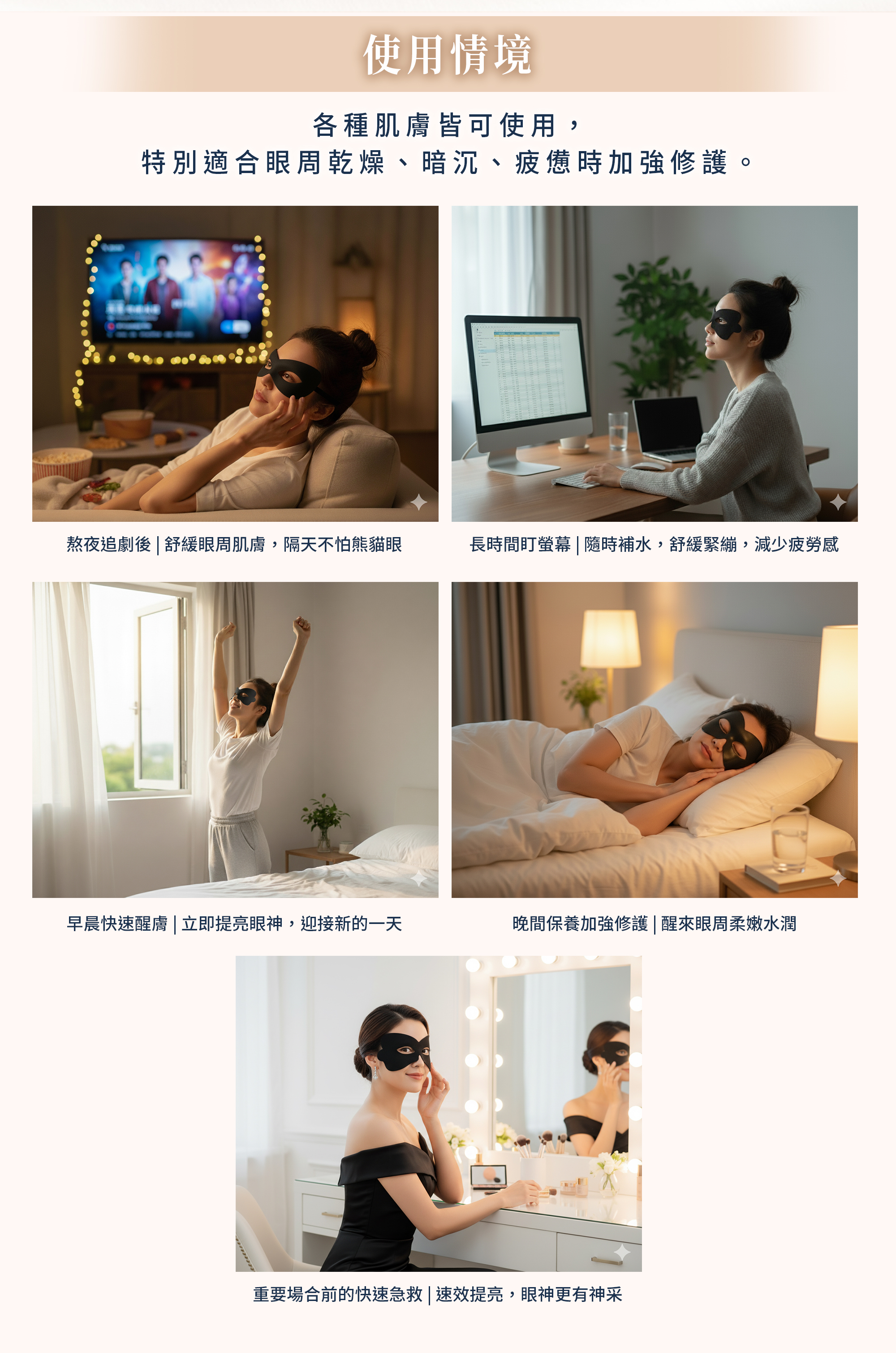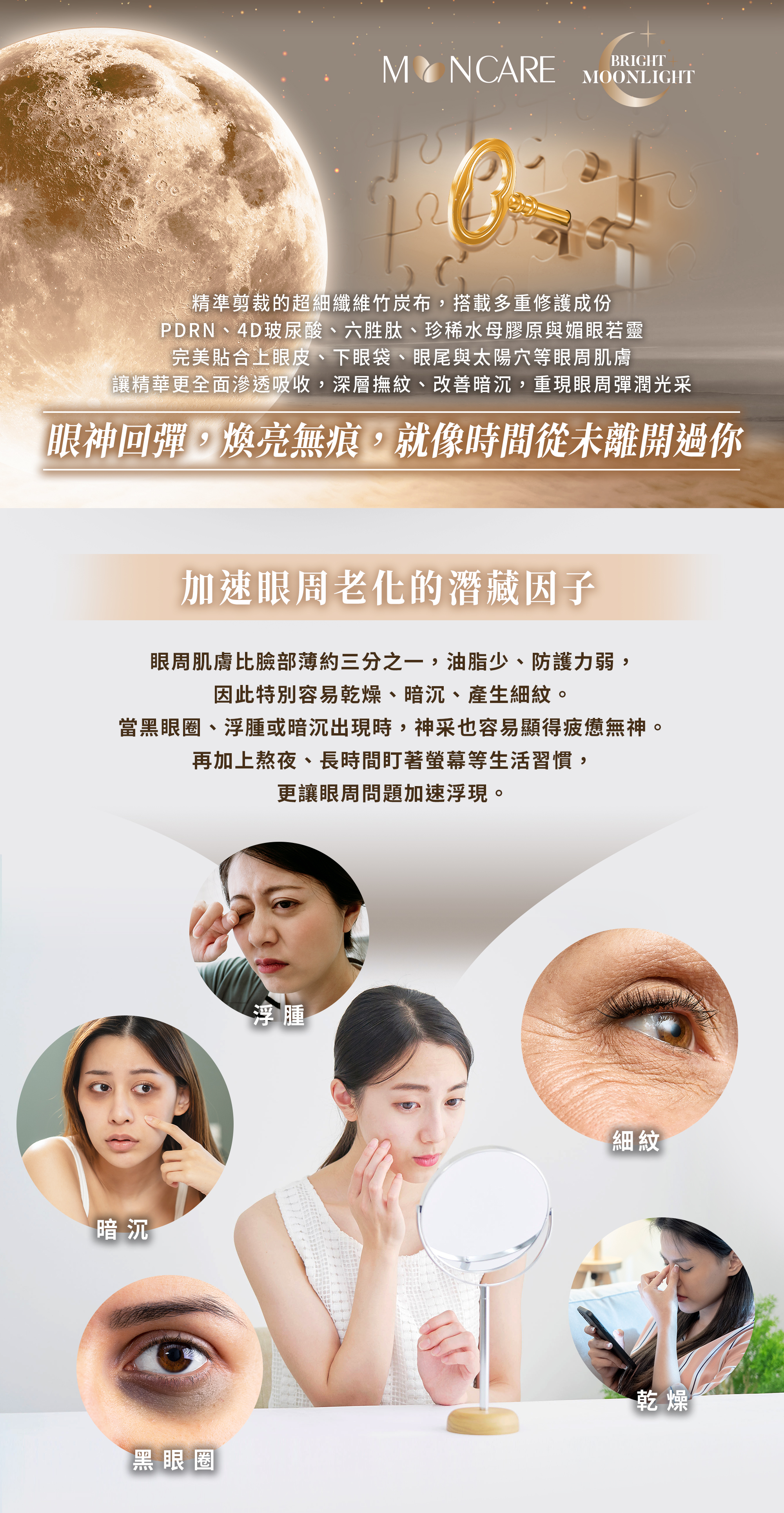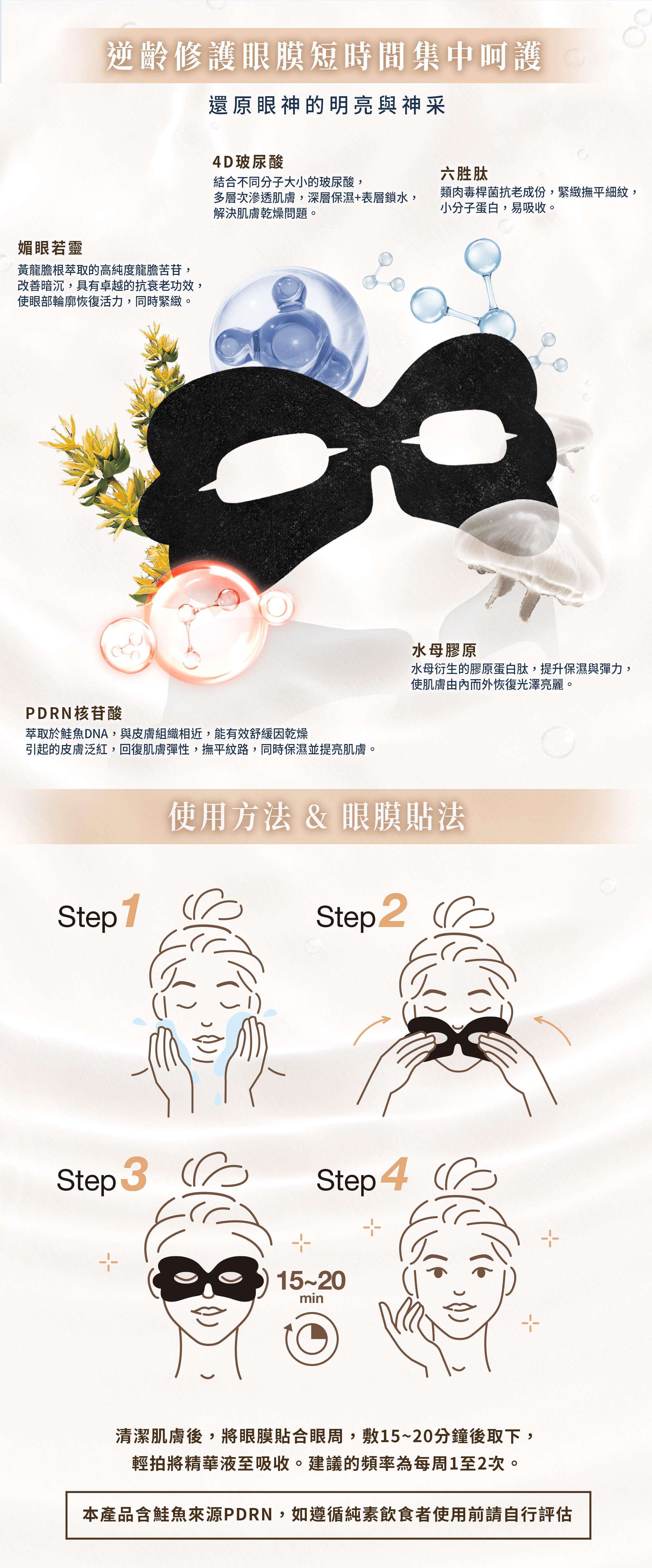 精準剪裁的超細纖維竹炭眼膜,搭載PDRN、4D玻尿酸、六胜肽、水母膠原與媚眼若靈,完美貼合眼周,深層滲透吸收,撫平細紋、改善暗沉,重現眼周彈潤光采。